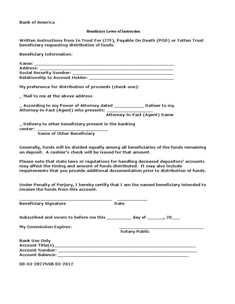 Beneficiary Letter Of Instruction Deposit Account Power Of